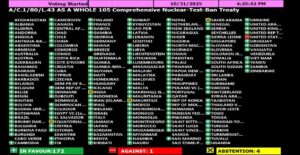 In forty-eight hours that mattered, two signals landed against the Comprehensive Nuclear-Test-Ban Treaty (CTBT) norm. First, at the UN General Assembly’s First Committee, the United States voted against the annual CTBT resolution while India abstained, per the official vote board displayed in the room on 31 October 2025 (formal UN documentation typically posts with delay). Second, prior to the voting on UN resolution, President Trump signalled through his Truth Social account that he had instructed the Pentagon to start testing U.S. nuclear weapons. The same week, NATO ran its Steadfast Noon nuclear-sharing drill, and U.S. Strategic Command opened Global Thunder 26, its annual nuclear command-and-control exercise. Earlier, Russia had tested Poseidon unmanned underwater vehicle and unmatched 9M730 Burevestnik nuclear-powered and nuclear-armed cruisle missile, clarifying that these cannot be regarded as nuclear tests in any way. Together, these moves thin the political canopy above a norm that remains scientifically robust and verifiably monitored.