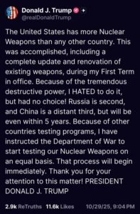 Cascades rarely begin with a plutonium pit of shaft firing. They begin with politics: a high-profile post, a conspicuous vote, an exercise announcement. Next comes preparation: new vertical shafts or horizontal drifts, stepped-up subcritical cadence, diagnostic upgrades, which are moves that are legal under a unilateral moratorium but lower time-to-test. Finally, a demonstration shot. In the week of 13-31 October 2025, each rung was visible: NATO and USSTRATCOM signalled readiness; Russia advertised Burevestnik; the U.S. voted “No” and floated “resumption” of testing. That is a classic signal-stack and a recipe for misperception under compressed timelines.