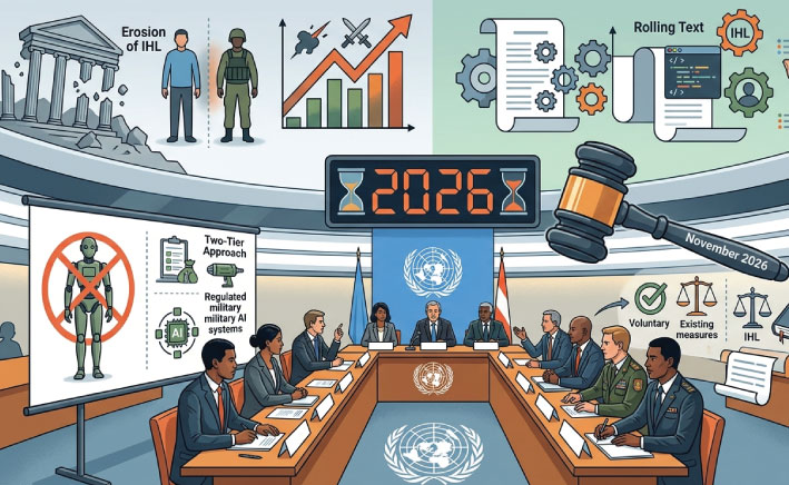 The growing deployment of autonomous and AI-enabled military systems in contemporary conflicts have intensified the demand for clearer international rules. With all these simultaneous challenges and pressures on the CCW in the area of LAWS, 2026 represents the final year for negotiation before the Seventh CCW Review Conference in the November 2026 sessions. Therefore, future regulatory framework of LAWS will likely emerge through a combination of agreements within the CCW, parallel diplomatic initiatives, and evolving interpretations of IHL. The CCW debates on LAWS represent a broader struggle to adapt global governance mechanisms to the realities of AI driven warfare. The CCW process has also demonstrated that international consensus on regulating emerging military technologies is possible, but often gradual and incremental.